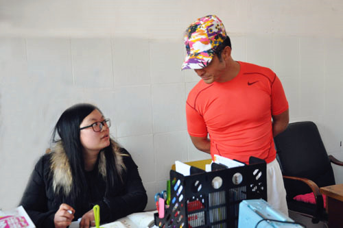 当走到散打新生班级的训练场地时,总教练认真仔细的观察着同学们训练时的动作。总教练表示,散打一定要做到先保护自己,所以准备动作一定要做到位,双拳要抬高,护住自己容易遭到对方攻击的脸部部位,他不仅耐心的解说,更手把手的纠正同学们的动作,威严中带着一种亲切。